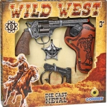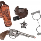 Užite si zábavu s touto kovbojskou sadou obsahujúcou kožené puzdro, opasok, šerifskú hviezdu, putá a bohato gravírovaný revolver.