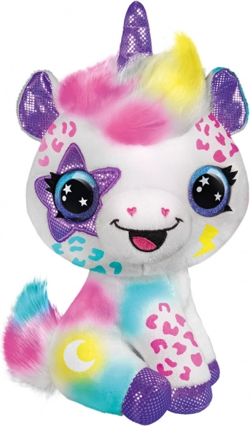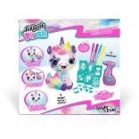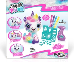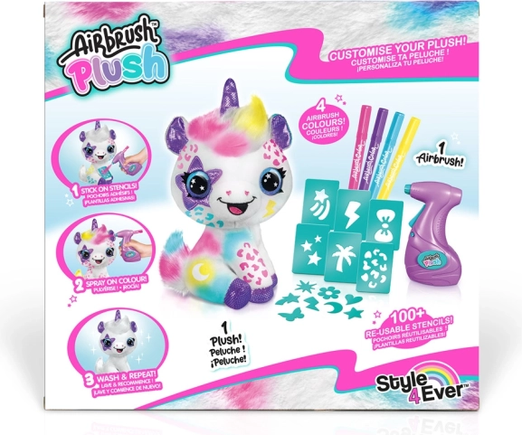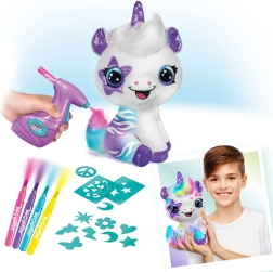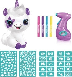 Objav kúzlo vlastného dizajnu s týmto kreatívnym setom: plyšový jednorožec, airbrush nástroj, 3 farebné náplne, 120 samolepiacich šablón a ochranné rukavice. Svojho maznáčika môžeš ľubovoľne nastriekať, vyprať v studenej vode a začať znova – nekonečná zábava pre deti od 6 rokov. Vyžaduje 2× AA batérie (nie sú súčasťou balenia).