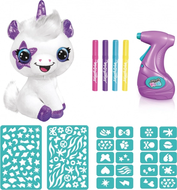 - Plyšový jednorožec, airbrush nástroj, 3 farebné náplne, 120 samolepiacich šablón, plastové ochranné rukavice, návod