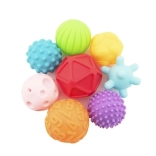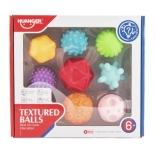 Táto sada textúrovaných loptičiek je ideálna pre deti od šiestich mesiacov veku. Sú vyrobené zo silikónového materiálu, ktorý poskytuje príjemný dotyk a umožňuje jednoduché uchopenie. Rôzne textúry na povrchu loptičiek stimulujú zmyslové vnímanie.