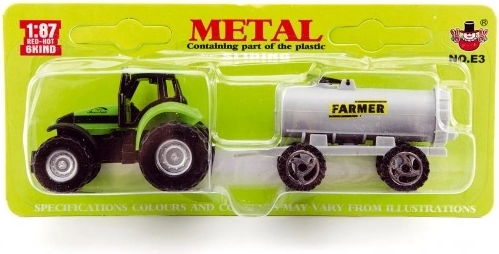 Model traktora s veľkými čiernymi kolesami a sivým tankerom, označeným ako 'FARMER'.