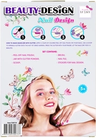 - 1× zlupovací lak, 1× samolepky na nechty, 1× dózička s trblietkami, 1× štetec, 1× pilník na nechty, 1× lyžička