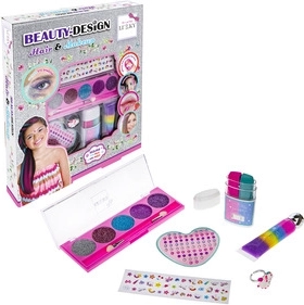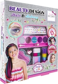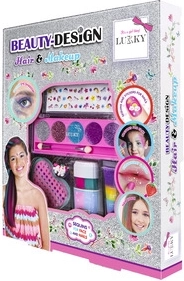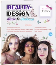 Objavte svet krásy s hravou sadou Lukky Beauty Design Vlasy & make‑up, ktorá je navrhnutá špeciálne pre deti. V balení nájdete všetko pre jednoduché a bezpečné skrášlenie: trblietavé krémové tiene s aplikátorom, jahodový lesk na pery, farebnú kriedu na vlasy, samolepky na nechty a žiarivé „drahokamové“ nálepky na tvár. Nechýba ani rozkošný prstienok s motívom jednorožca.