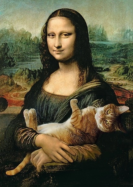 Motív Mona Lisy s mačkou Mruczek pridáva do klasickej umeleckej scény zábavný a hravý prvok.