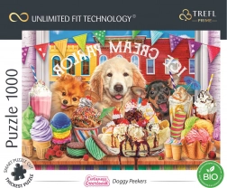 Trefl Unlimited Fit Technology (UFT) prináša nový rozmer skladania: jednotlivé motívy zo série možno ľubovoľne napájať a vytvárať tak veľké puzzle koláže bez obmedzení. Motív rozkošných psíkov pred cukrárňou poteší milovníkov zvierat aj kvalitného dizajnu.