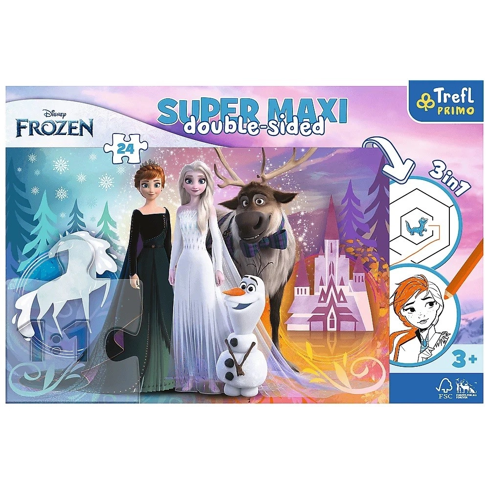 Veľkoformátové puzzle Super Maxi 24 spája radosť zo skladania s kreativitou. Predná strana ponúka farebný motív z obľúbeného sveta DISNEY FROZEN, zatiaľ čo zadná strana skrýva maľovanku a jednoduchú hru s vyfarbovaním – skvelý spôsob, ako si deti precvičia sústredenie, koordináciu oko–ruka a rozpoznávanie tvarov a farieb.