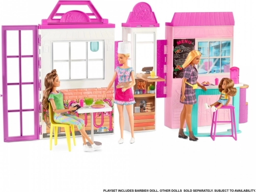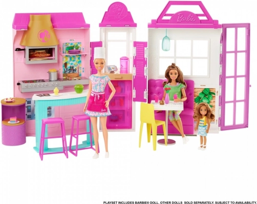 Táto realistická herná sada z prostredia rýchleho občerstvenia prináša deťom neobmedzené možnosti hry a rozprávania príbehov. Štýlový dizajn, funkčné prvky a bohatá výbava podnecujú predstavivosť – od prijímania objednávok až po servírovanie pri pulte aj vo vonkajšom boxe. Súčasťou je bábika BARBIE v šatách, rozkošnej ružovej zástere a kuchárskej čiapke, pripravená stať sa kuchárkou, čašníčkou aj zákazníčkou.
