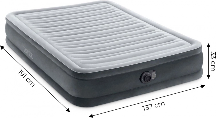 Praktická nafukovacia posteľ pre dve osoby s rozmermi 191 × 137 × 33 cm a integrovanou elektrickou pumpou na rýchle nafúknutie aj vyfúknutie. Ponúka pevnú oporu chrbtice vďaka technológiám Fiber-Tech a Dura-Beam, je z odolného PVC s príjemným velúrovým povrchom, unesie až 272 kg a súčasťou je transportná taška aj opravná záplata.