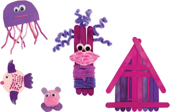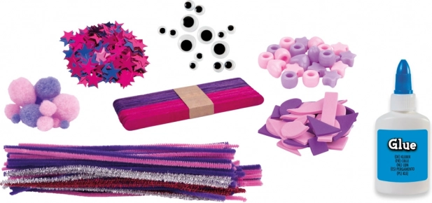 Chlpaté drôtiky, bambuľky, penové tvary, koráliky, samolepiace očká a trblietavé aj klasické lepidlo – ideálna kombinácia na nespočet výtvarných projektov.