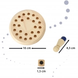 • Obsah balenia: kruhová doska s otvormi, 24 drevených kolíčkov v 6 farbách, drevená kocka s farbami