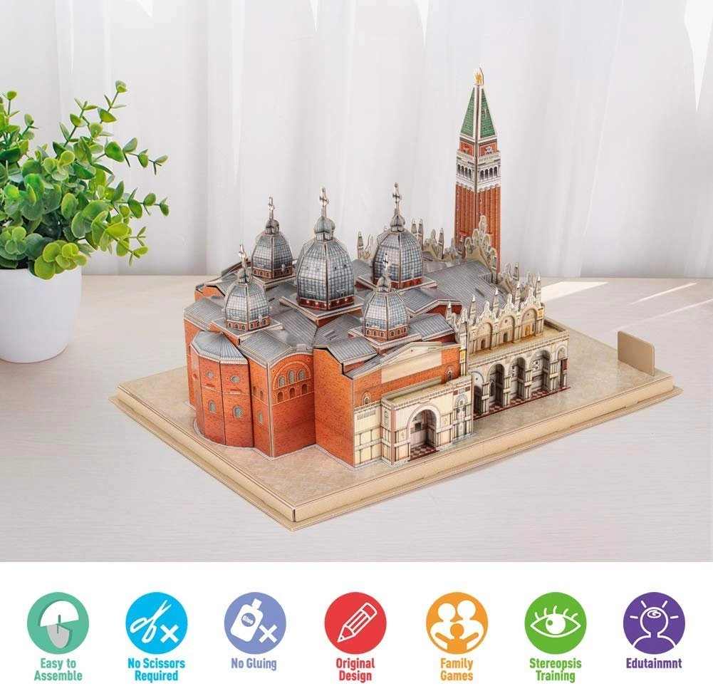Objavte čaro Benátok vďaka detailnej stavebnici Námestie svätého Marka. 3D puzzle CUBICFUN z edície National Geographic je vyrobené zo špeciálnej viacvrstvovej peny potiahnutej laminovaným potlačeným papierom, ktorý zaručuje krásne farby a dlhú životnosť. Diely sú predražené – stačí ich jednoducho vylomiť a podľa návodu poskladať.