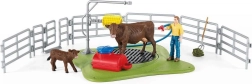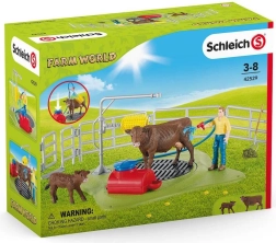 Sada obsahuje všetko potrebné: figúrky kravy, teliatka a farmára, ďalej príslušenstvo ako hadica, pumpa so striekacou funkciou, kefa na kravy, vŕbové ploty a brána. Kvalitné, ručne maľované detaily typické pre SCHLEICH podnecujú fantáziu a podporujú role-play s farmárskou tematikou.