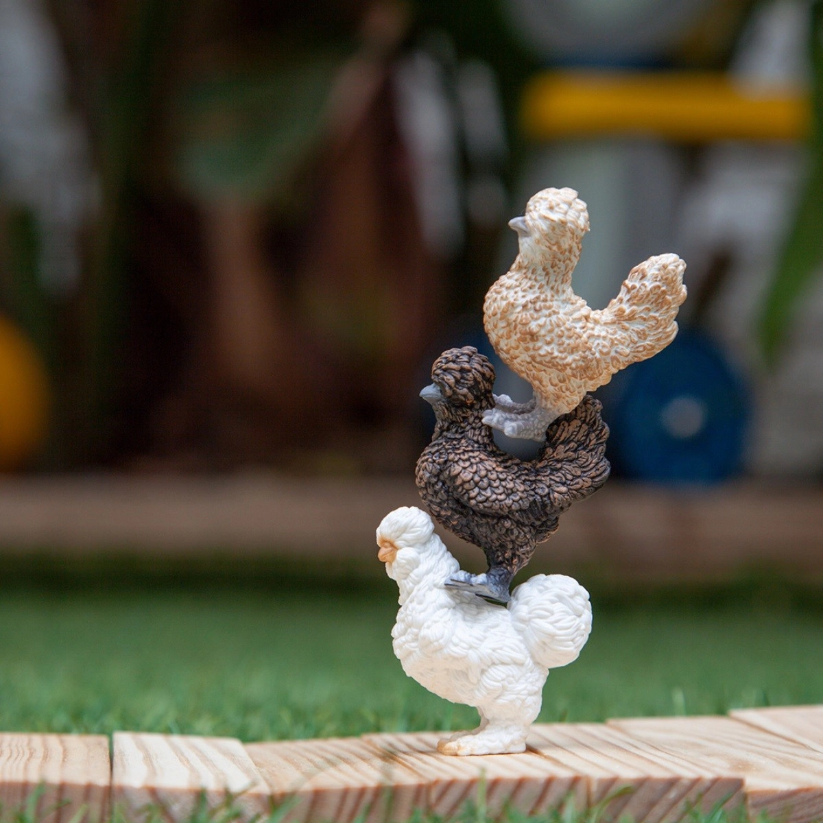 Deti ocenia odolný plast, stabilný postoj a tri odlišné farebné prevedenia, vďaka ktorým sliepočky ľahko rozlíšia. Sada je ideálna na samostatnú aj skupinovú hru, podporuje rozvoj jemnej motoriky, fantázie a príbehové rozprávanie.