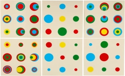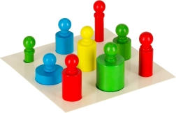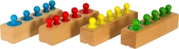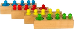 4× drevená podstavka; 5× zelený valec; 5× červený valec; 5× modrý valec; 5× žltý valec