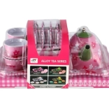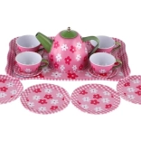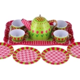 Zorganizujte čarovné čajové posedenie! Táto kvalitná detská čajová súprava z kovu obsahuje 14 kusov riadu na servírovanie a hranie rolí. Vďaka odolnému plechovému vyhotoveniu, farebným vzorom a praktickému tácku je ideálna na spoločné hranie detí od 3 rokov. Upozornenie: nejde o riad na skutočné používanie s nápojmi.