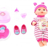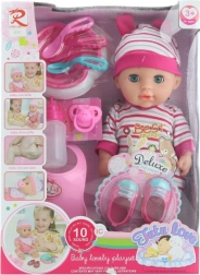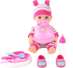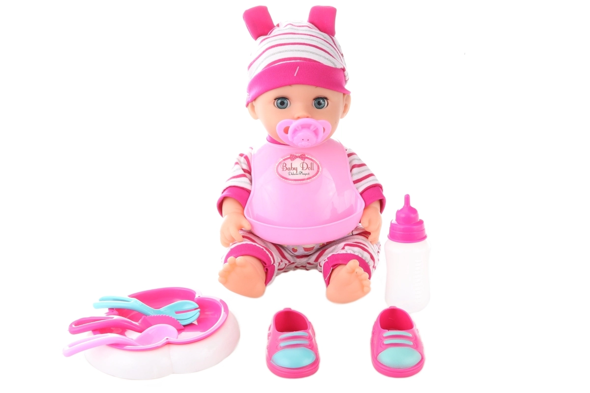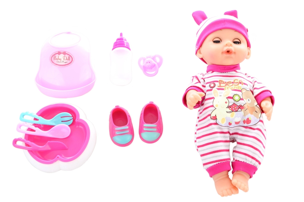 Súčasťou sady sú topánočky, plastový podbradník, fľaštička, tanierik, príbory a ďalšie doplnky pre pestrú fantazijnú hru.