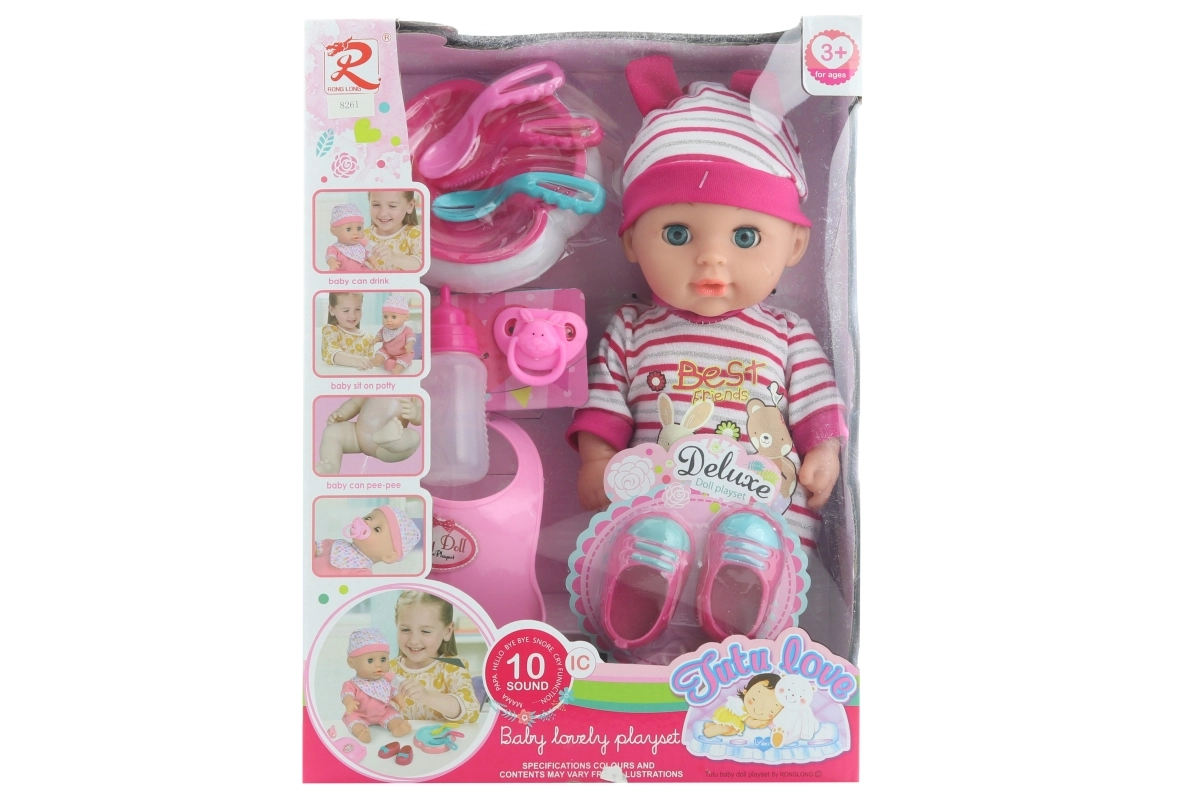- Interaktívne funkcie: bábätko vydáva zvuky a po napití čurá.