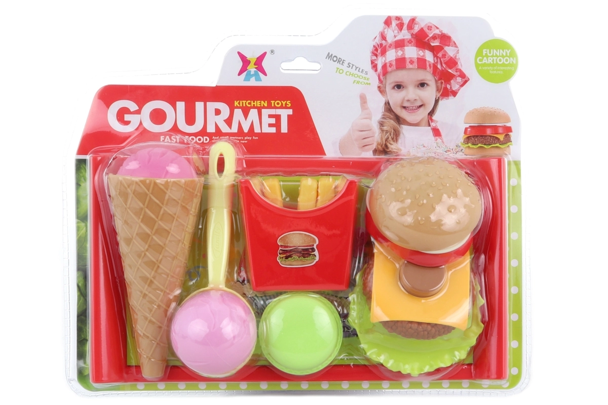 Zábavná detská sada plastových potravín s táckou na hranie sa na kuchyňu či reštauráciu. Obsahuje zmrzlinu v kornútku, kopeček zmrzliny s naberačkou, makrónku, hranolky a hamburger rozložiteľný na jednotlivé ingrediencie. Ideálne na rozvoj fantázie, jemnej motoriky a spoločnú hru.