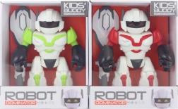 Plastový robot na batérie so štítom a pištoľou. Robot chodí, otáča sa, vydáva zvuky a svieti. Napájanie na 3 AA batérie (nie sú súčasťou balenia). Rozmery robota cca 16 x 21 cm. Rozmery balenia cca 19,5 x 24 x 9,5 cm. Vek 3+