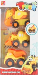 V balení nájdete tri obľúbené stroje – bager, nakladač a sklápač. Každé vozidlo má hladké tvary vhodné pre malé deti a je prispôsobené bezpečnému hraniu od 12 mesiacov.