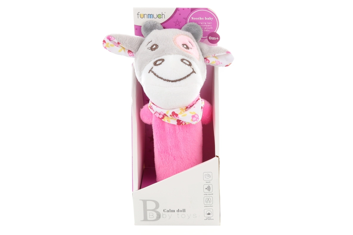 Táto pískacia hrkálka v podobe ružovej kravičky je hebká na dotyk a navrhnutá pre najmenších používateľov. Pri stlačení vydáva jemný pískací zvuk, ktorý priťahuje pozornosť a podporuje rozvoj sluchu. Vďaka kompaktným rozmerom sa ľahko drží a je ideálna na tréning jemnej motoriky a úchopu.