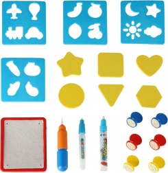 Súčasťou balenia sú pečiatky, šablóny, vodné fixky a štetec. Deti sa učia tvary, farby a zlepšujú jemnú motoriku.
