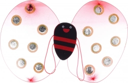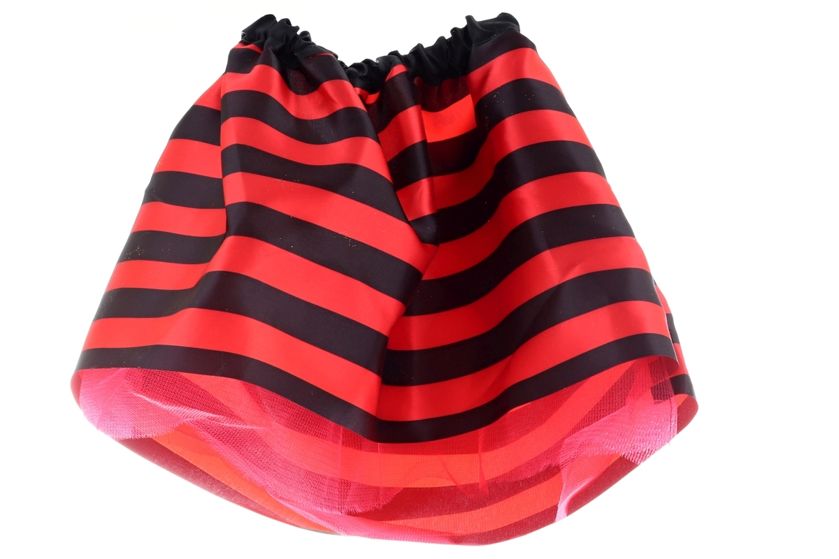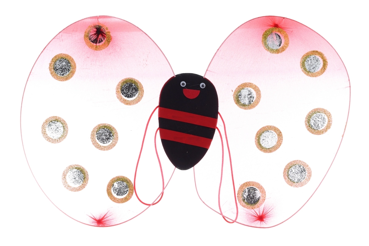 Súčasťou sú priesvitné ružovo-červené krídla s trblietavými bodkami, elastická sukňa v červeno-čiernom prúžku, čelenka s pružnými tykadlami a ladiaca palička so stužkami. Veľkosť sady je navrhnutá pre deti od 3 rokov; rozmer balenia cca 49 × 57 cm.
