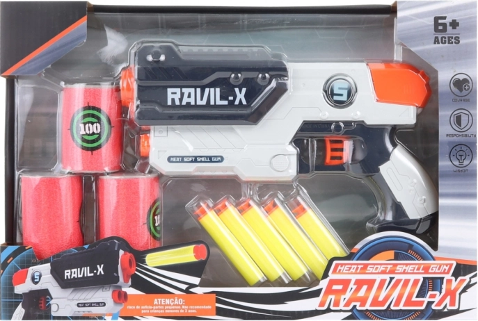 - Kompletná sada – pistola, 5 nábojov a 3 penové terče v balení.
