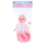 Plastové cikajúce bábätko. Balenie obsahuje nočník, fľaštičku a plienku. Rozmer balenia cca 37 × 18 × 8 cm. Vek 3+