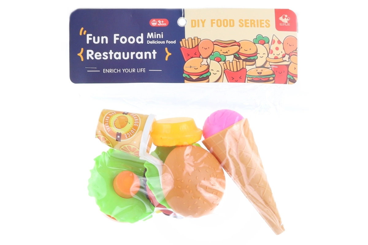 • Obsah sady: rozložiteľný hamburger, zmrzlina v kornútku, koláč, nápoj