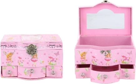 Šperkovnica so zásuvkami. Vo vnútri veka šperkovnice sa nachádza zrkadielko a v spodnej časti šperkovnice sa nachádzajú 3 praktické zásuvky. Rozmer šperkovnice cca 17 × 11,5 × 10 cm. Balené v sáčku. Vek 3+
