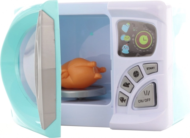 Táto detská mikrovlnka v kombinácii tyrkysovej a bielej farby je ideálny doplnok do každej detskej kuchynky. Po zapnutí sa tanier vo vnútri otáča a hra je sprevádzaná svetelnými efektmi, ktoré verne napodobňujú skutočný spotrebič.