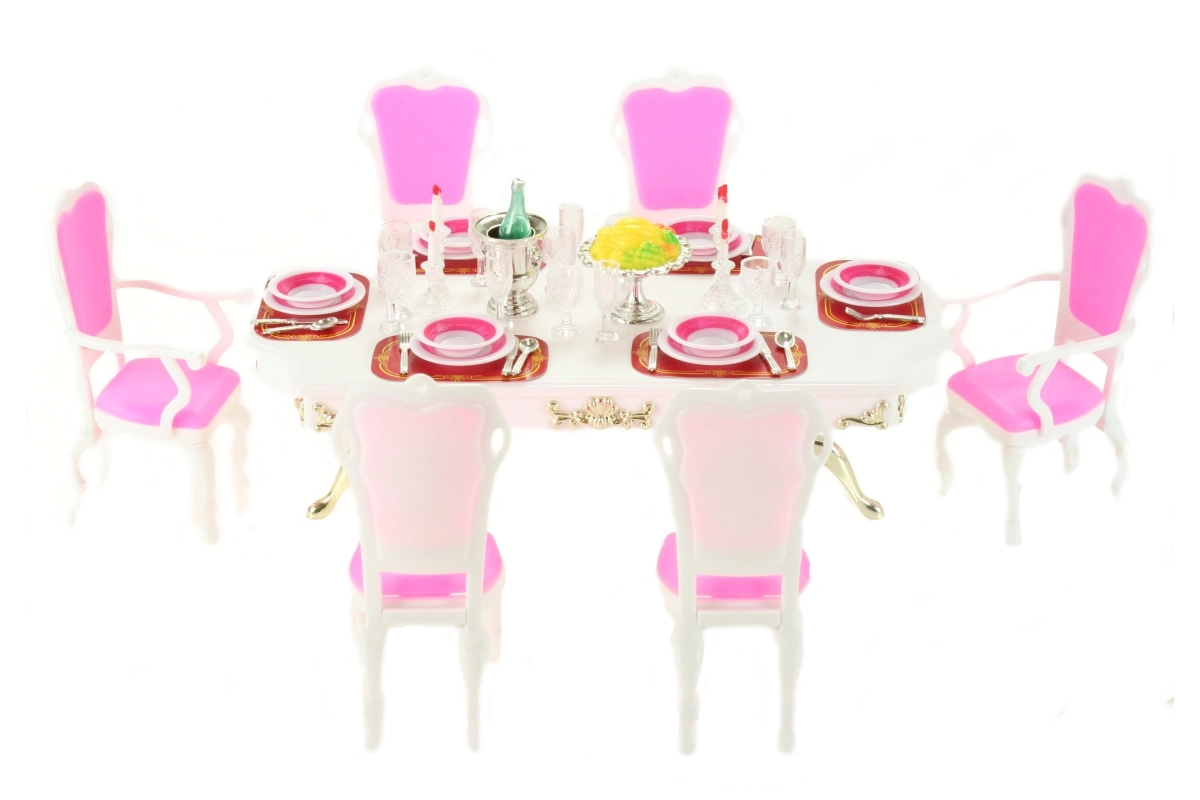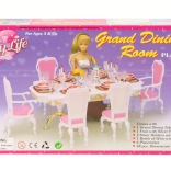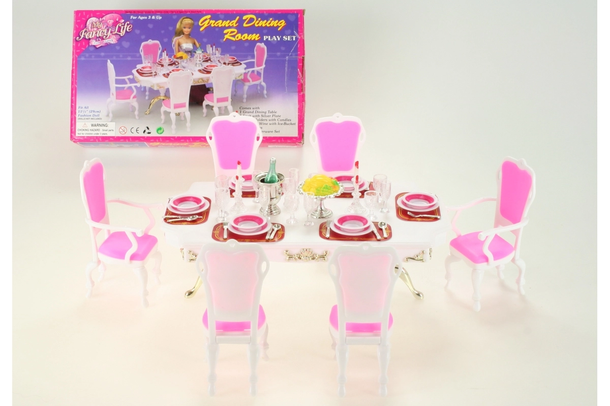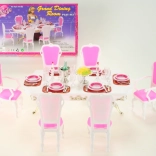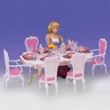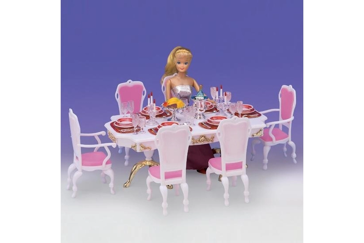 Štýlová sada Glorie pre bábikovské stolovanie premení každý detský izbičku na elegantnú jedáleň. Obsahuje veľký plastový stôl, 6 stoličiek (2 s opierkami rúk) a bohaté prestieranie stola vrátane pohárov, tanierov a príborov. Ideálne pre kreatívnu hru detí od 3 rokov.