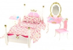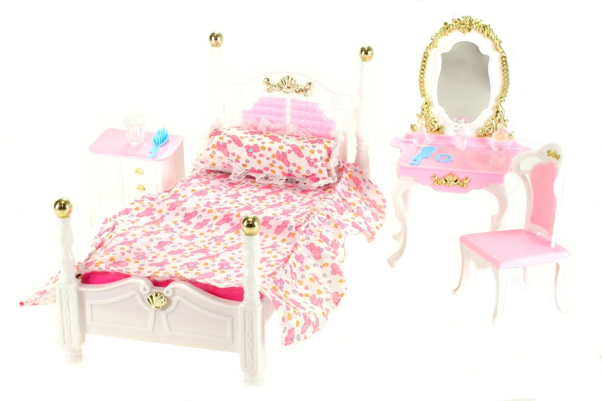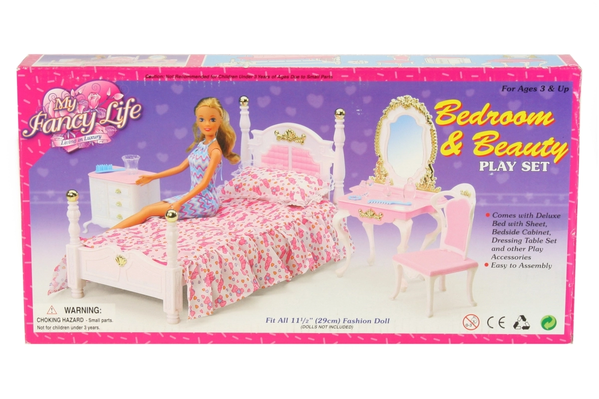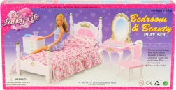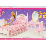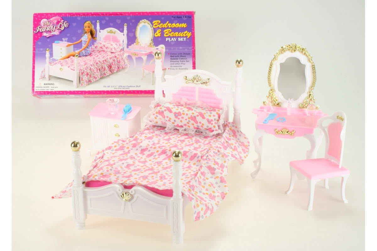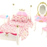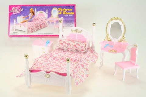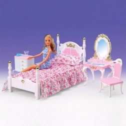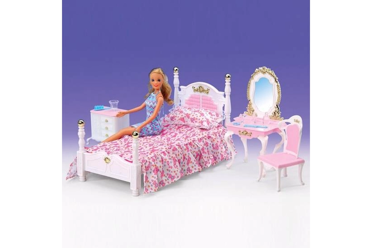 Glorie Spálňa obsahuje plastovú posteľ s rozmermi cca 16 cm × 34 cm × 18 cm s prehozom cez posteľ a vankúšikom, kozmetický stolík s rozmermi cca 13 cm × 8 cm × 22 cm s doplnkami pre bábiky – hrebeň, náramok, kefa a fľaštičky, kreslo cca 7 cm × 7 cm × 13 cm, nočný stolík cca 8,5 cm × 6 cm × 8 cm. Bábika nie je súčasťou balenia. Vek 3+
