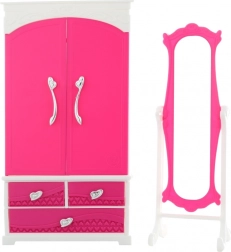 Šatníková skriňa GLORIE so zrkadlom je skvelým doplnkom do sveta bábik. Ponúka otváracie dvierka a zásuvky na uloženie šatočiek a doplnkov a praktické vešiaky na zavesenie obľúbených outfitov. Vďaka priloženému zrkadlu môžu deti ľahko kombinovať a skúšať nové štýlové kreácie.