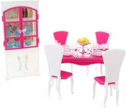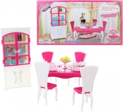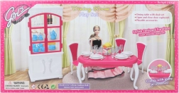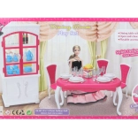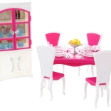 Glorie jedálenský set pre bábiky ponúka kompletný jedálenský zážitok s elegantným plastovým stolom, štyrmi stoličkami a skrinkou, doplnený o taniere, poháriky, príbory a dekoratívne doplnky.