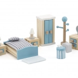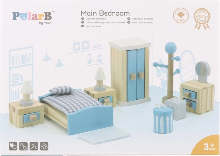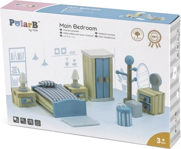 Drevená spálňa VIGA POLARB premení každý domček pre bábiky na útulné miesto na hranie. Súprava obsahuje posteľ, 2 nočné stolíky, skriňu, vešiak, toaletný stolík so stoličkou, koberec a košík – všetko v jemnej modrej a prírodnej farbe. Kvalitné spracovanie, hladké hrany a netoxické farby zaručujú bezpečnú hru, zatiaľ čo bohatá výbava podporuje fantáziu, kreativitu a rolové hry detí.
