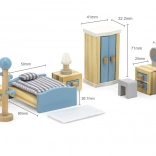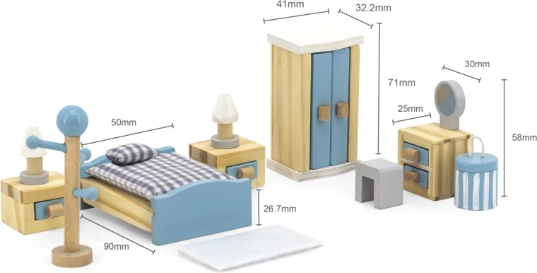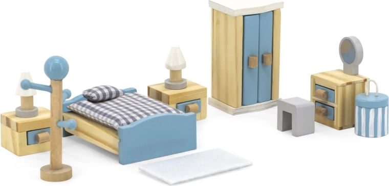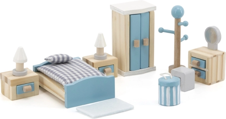 Táto premyslená drevená súprava nábytku do domčeka pre bábiky prináša kompletnú výbavu spálne v jemnej, deťom príjemnej farebnosti. Každý diel je vyrobený s dôrazom na detaily a odolnosť, aby dlhodobo bavil a rozvíjal detskú predstavivosť.