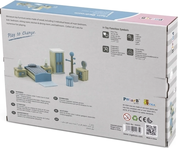 VIGA POLARB stavia na bezpečných, netoxických farbách a precíznom leštení hrán. Súprava je ideálna ako darček a možno ju rozšíriť o ďalšie izby z rovnakej série (detská izba, obývacia izba, kuchyňa, kúpeľňa), takže si dieťa vytvorí vlastný svet podľa svojich predstáv.