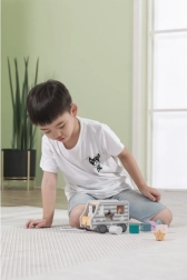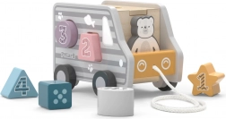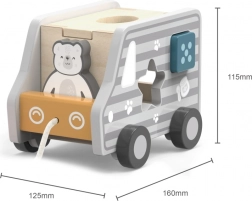 Drevená ťahačka a vkladačka v tvare nákladného auta. Rozmery cca 18 × 12 × 6,5 cm. Rozmery balenia cca 19 × 16,5 × 13,5 cm. Vek 18m+