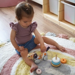 Hračka rozvíja koordináciu, kreativitu a predstavivosť a krásne doplní zbierku drevených hračiek v tlmených farbách. Vhodná na každodenné hranie doma aj na cestách.