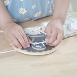 Hladké drevené dieliky s bezpečnými otvormi a pevnými šnúrkami. Ideálne na každodenné precvičovanie jemnej motoriky.