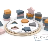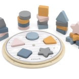 Deti priraďujú drevené dieliky k výrezom na doske a pritom si prirodzene osvojujú farby aj základné tvary – kruh, štvorec, trojuholník či hviezdu.