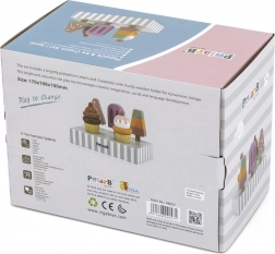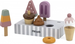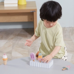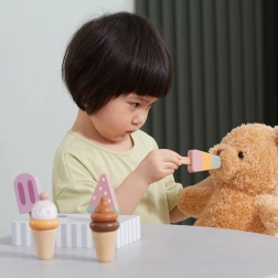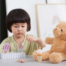 Farebná sada piatich drevených nanukov na pevnom stojane pre kreatívnu hru na obchod aj kuchynku. Hračky z kvalitného dreva s netoxickými farbami podporujú jemnú motoriku, fantáziu a spoločenské zručnosti. Ideálne na rolové hry a štýlovú prezentáciu aj ukladanie v detskej izbičke.