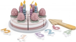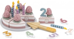 - 6 dielikov torty, odnímateľné sviečky, ozdobné jahôdky, číselné kocky, tanier, drevená lopatka