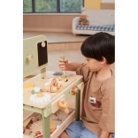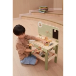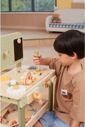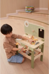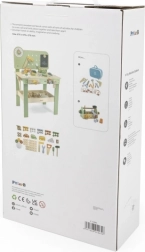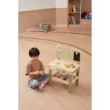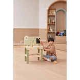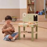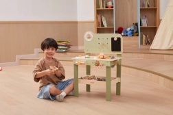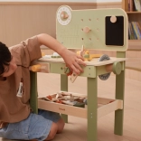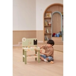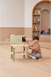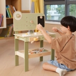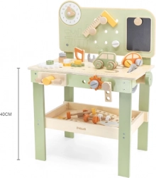 Štýlový detský ponk v prírodno‑zelenom prevedení ponúka realistický zážitok z dielne v bezpečnej, drevenej podobe. Deti môžu skrutkovať, meniť kolieska na autíčku, „rezať“ dieliky, skladať ozubené kolieska a objavovať princípy príčiny a následku. Vďaka prehľadnému úložnému priestoru zostanú všetky diely a náradie vždy po ruke.