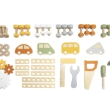 - Bohaté príslušenstvo: náradie, skrutky, matice, doštičky, ozubené kolieska, autíčko a hodiny s ručičkami.