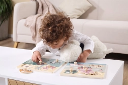 Ilustrácie na podložke napovedajú správne umiestnenie dielikov. Deti si prirodzene precvičujú rozpoznávanie tvarov, farieb a zvierat.