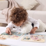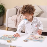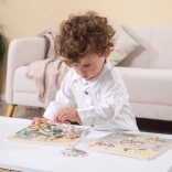 Drevená vkladačka s motívom dopravných prostriedkov. Rozmer drevenej dosky cca 22 x 22 cm. Rozmer balenia cca 22 x 22 x 2,5 cm. Vek 18m+