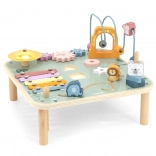 Multifunkčný drevený stolík VIGA PolarB je dostatočne priestranný, aby sa pri ňom mohlo hrať viac detí naraz. Kvalitné spracovanie z dreva a kovových vodičov zaisťuje stabilitu a dlhú životnosť. Deti môžu objavovať zvuky na xylofóne aj gongu, precvičovať motoriku na korálkovom bludisku, vkladať tvary do správnych otvorov a skúmať princípy ozubených koliesok.
